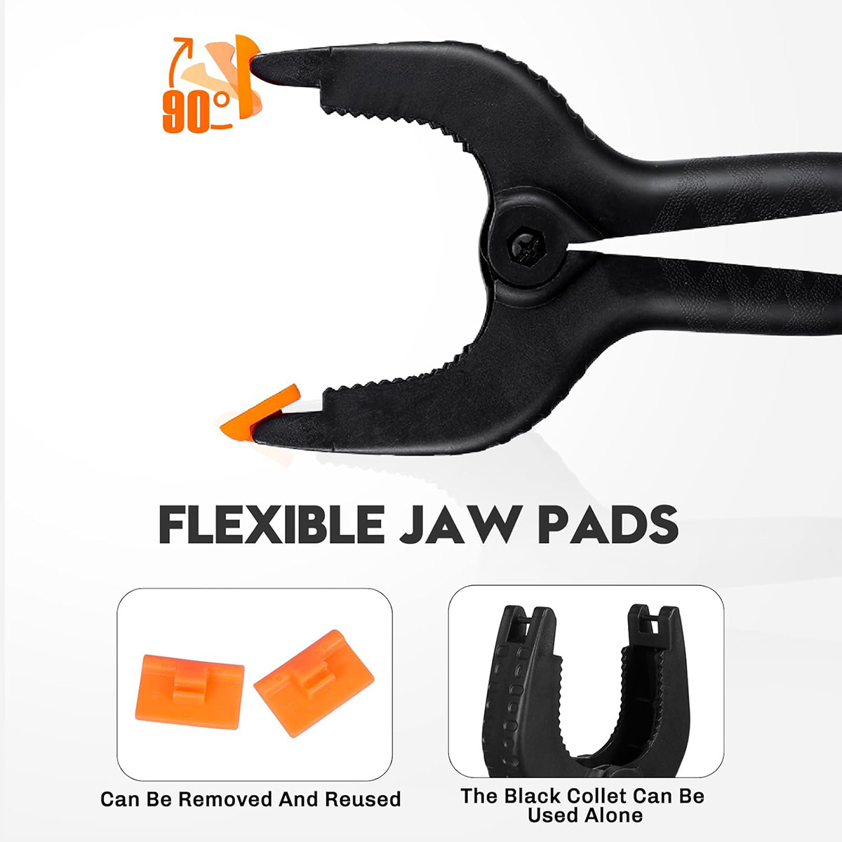 - Flexible Jaw Pads: The spring clamps’ jaw pads can be rotated 90 degrees to adapt to different shapes of objects. Additionally, the removable feature makes these spring clips very easy to use